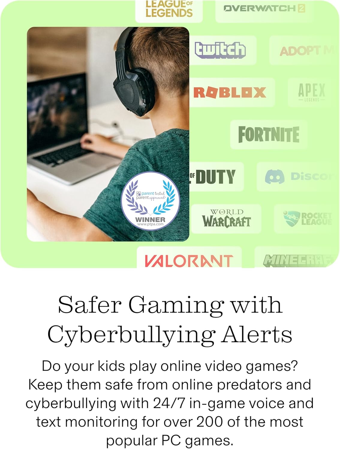 SAFE GAMING – Get alerted to dangers in online games. Monitor over 200 popular games and apps. (Windows PC only)