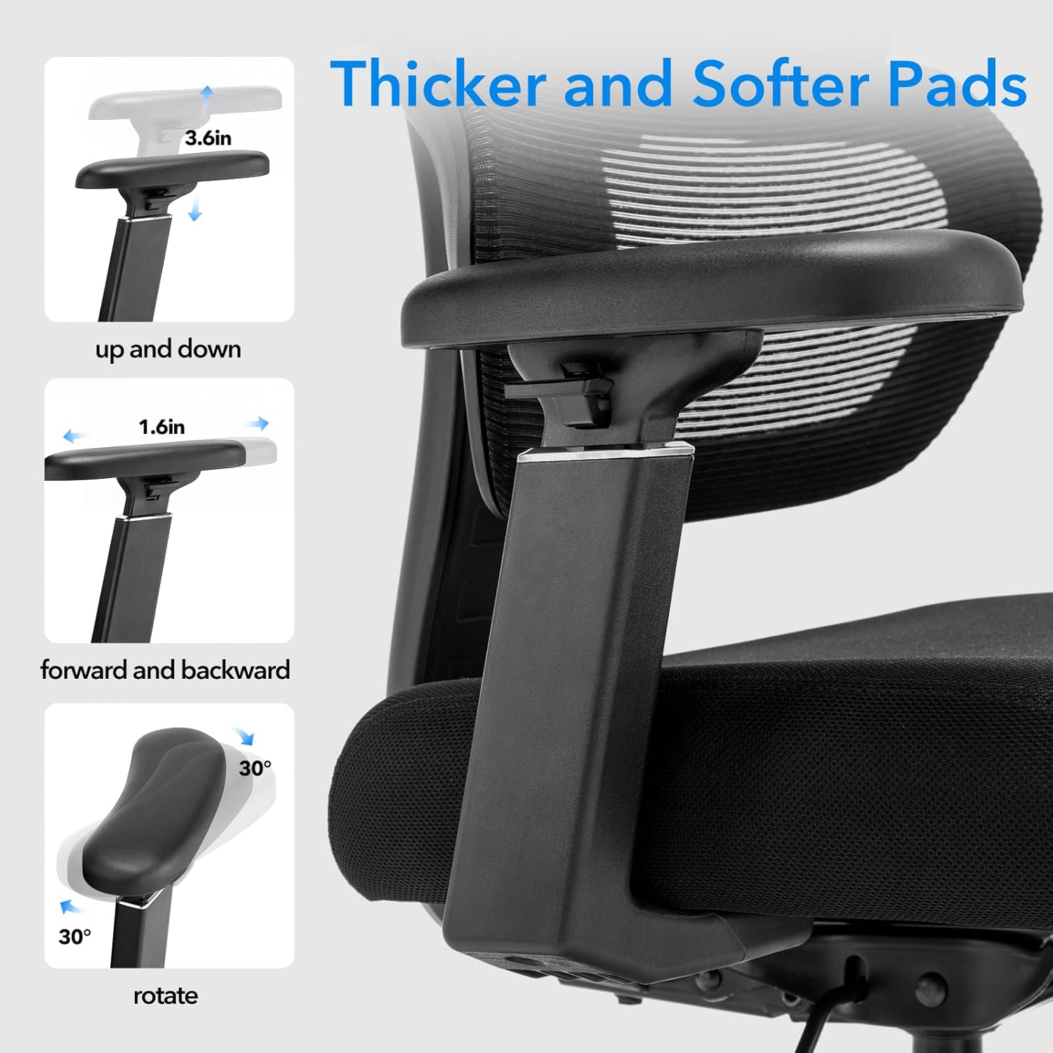 【Arm Support & Customization】: The 3D adjustable armrests feature thick, soft padding with 3.6 inches vertical adjustment, 1.6 inches horizontal movement, and 30° rotation. Customize arm support for typing, gaming, multitasking, or extended sitting, creating a fully ergonomic and comfortable work chair experience.