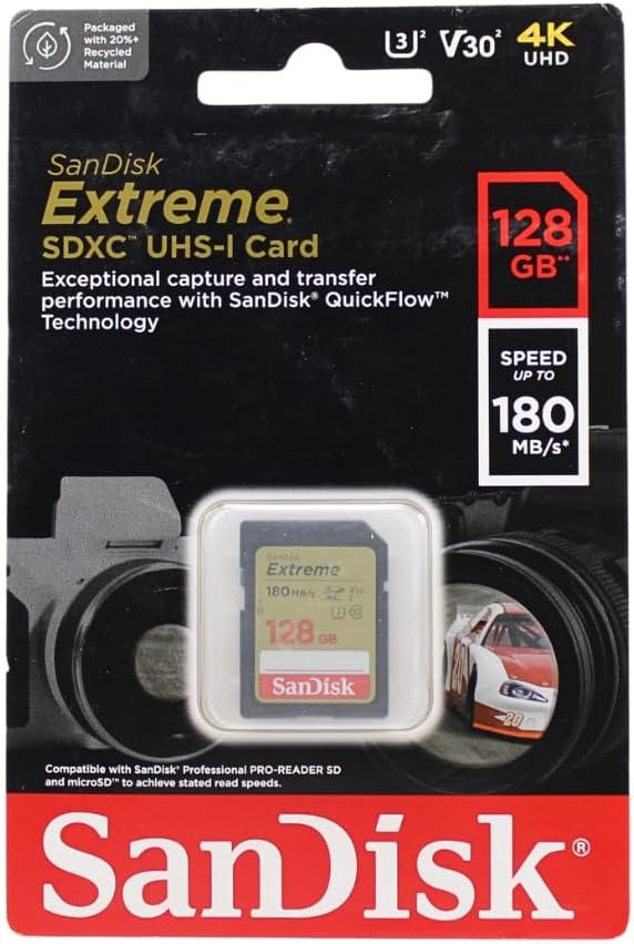 With the SanDisk Extreme SD UHS-I memory card save time transferring media with read speeds of up to 180MB/s(1) powered by SanDisk QuickFlow Technology(2). Pair with the SanDisk Professional PRO-READER SD and microSD to achieve maximum speeds (sold separately). With shot speeds of up to 90MB/s(1) and UHS speed Class 3 (U3)(4) recording, you’re ready to capture high-resolution, stutter-free 4K UHD video(3). | (1)Up to 180MB/s read speeds. Engineered with proprietary technology to reach speeds beyond UHS-I 104MB/s, require compatible devices capable of reaching such speeds. Write speeds up to 90MB/s. Based on internal testing; performance may be lower depending on host device, interface, usage conditions and other factors. 1MB=1,000,000 bytes. (2)SanDisk QuickFlow Technology is only available for 64GB, 128GB, 256GB, and 512GB capacities. 1GB=1,000,000,000 bytes. Actual user storage less. (4)UHS Speed Class 3 designates a performance option designed to support 4K UHD video recording with enabled UHS host devices. UHS Video Speed Class 30 (V30), sustained video capture rate of 30MB/s, designates a performance option designed to support real-time video recording with UHS enabled host devices. See the SD Association’s official website. (3)Full HD (1920×1080) and 4K UHD (3840 x 2160) video support may vary based upon host device, file attributes and other factors. See HD page on SanDisk site.