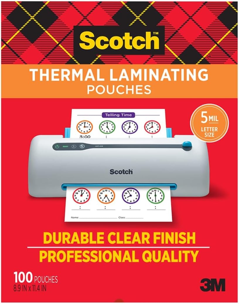 Scotch Thermal Laminating Pouches are ultra-clear pouches that protect and add professionalism to frequently used documents. These laminating pouches allow important information to show through with a clear, photo-safe* finish(*in accordance with ISO 18916). Perfect for creating marker-proof, tear-proof, and spill-proof items, they are ideal school supplies for teachers. Use laminate pouches for laminating signs, flyers, schedules, certificates, to-do lists, children’s artwork, and more. Lamination pouches are classroom must-haves and suitable for teachers. These laminator pouches can be cleaned with most household cleaners without damage. Each package contains letter-size pouches fitting items up to 8.9 in. x 11.4 in., with 100 pouches per pack. For optimal results, use these pouches with Scotch Brand Thermal Laminators. Essential for all classrooms, they are perfect for preschool, kindergarten and grade-school teachers.