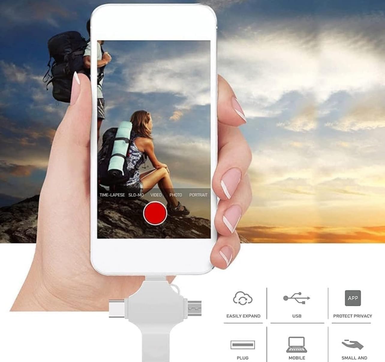 Multi-Interface Design: USB 4 in 1 usb flash drive comes with IOS port/USB A/Micro USB/Type C, compatible for iOS/Android/PC and other devices with standard USB ports, can transfer data between various devices, easily complete data sharing.Lightweight & Portable: photo stick size is 4.4*4.0*0.35cm , small and exquisite, which is convenient for us to carry.Plug and Play: Share your photos, videos, songs and other files between Phone picture stick easily. You don’t have to pay extra for additional storage, just insert external storage and enjoy the extra space of your memory stick.One-Click Backup: You can easily backup with one click and manage files at any time. No need of iTunes, manage files, phone address book, pictures and videos through the mobile app to quickly backup to data stick, save the storage space of the mobile phone, and at the same time, operations such as forwarding files on the usb flash drive can be performed.Protect File Privacy: The General Password & Touch ID can encrypt file information in APP to protect your private files and prevent theft.